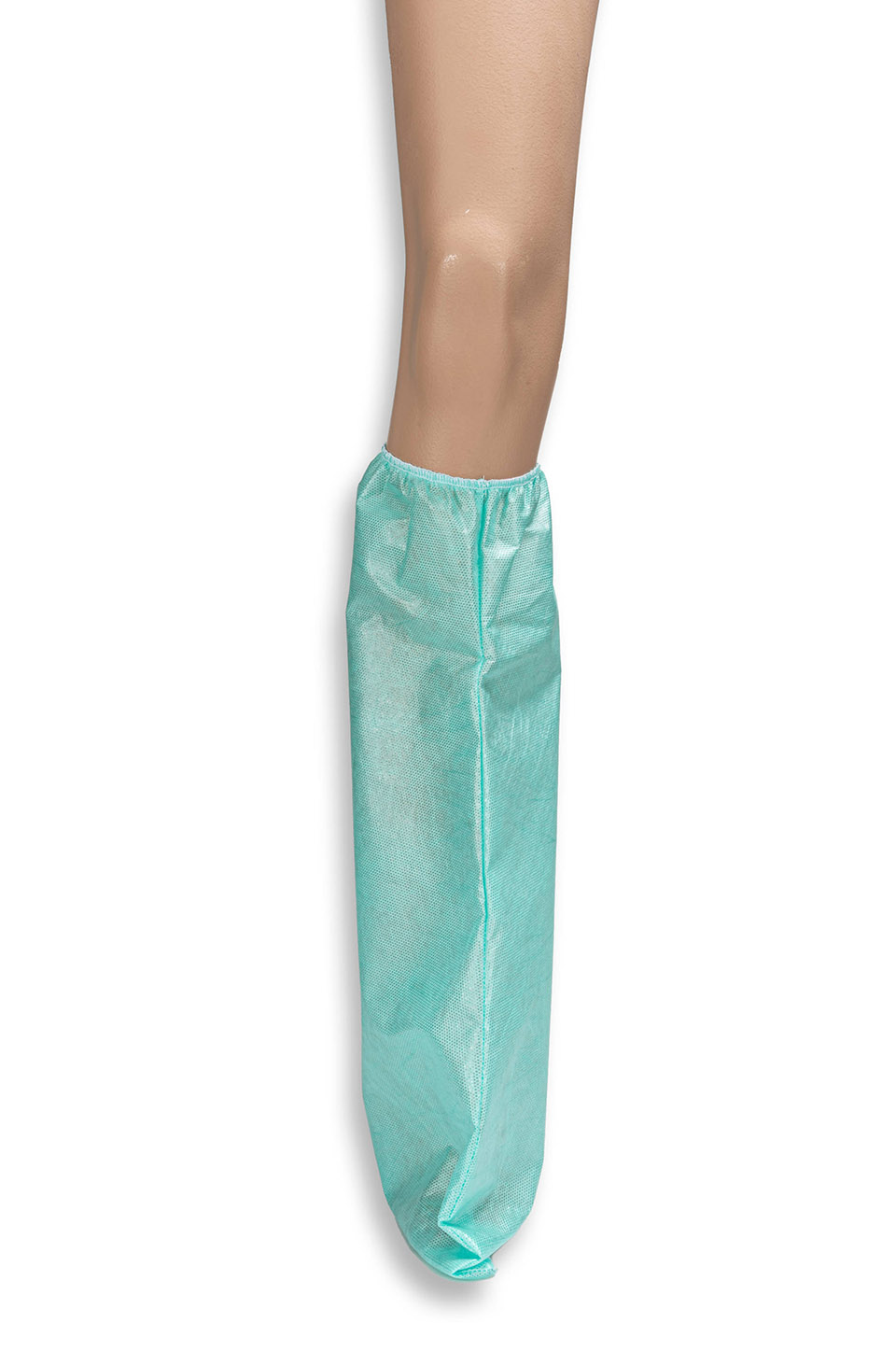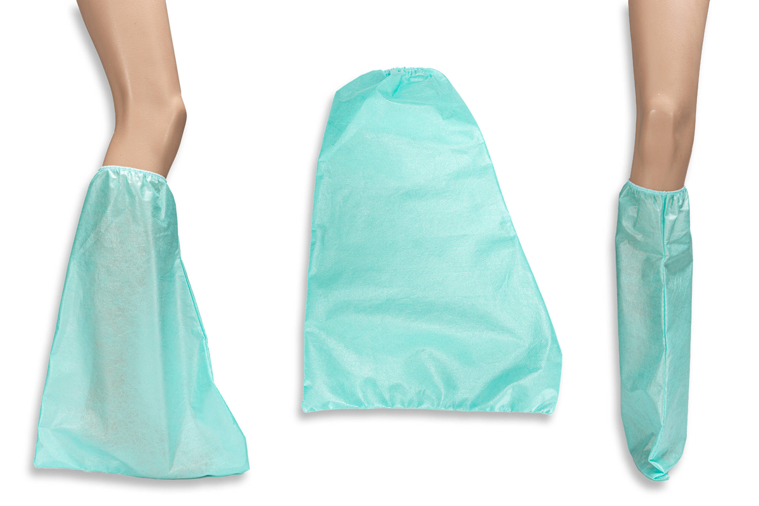 Calzare lungo, colore verde, base antiscivolo senza lattice, elastico stringigamba senza lattice. Accessori con certificazione Oeko-Tex. Cucito a macchina e realizzato in forma non sterile e monouso.