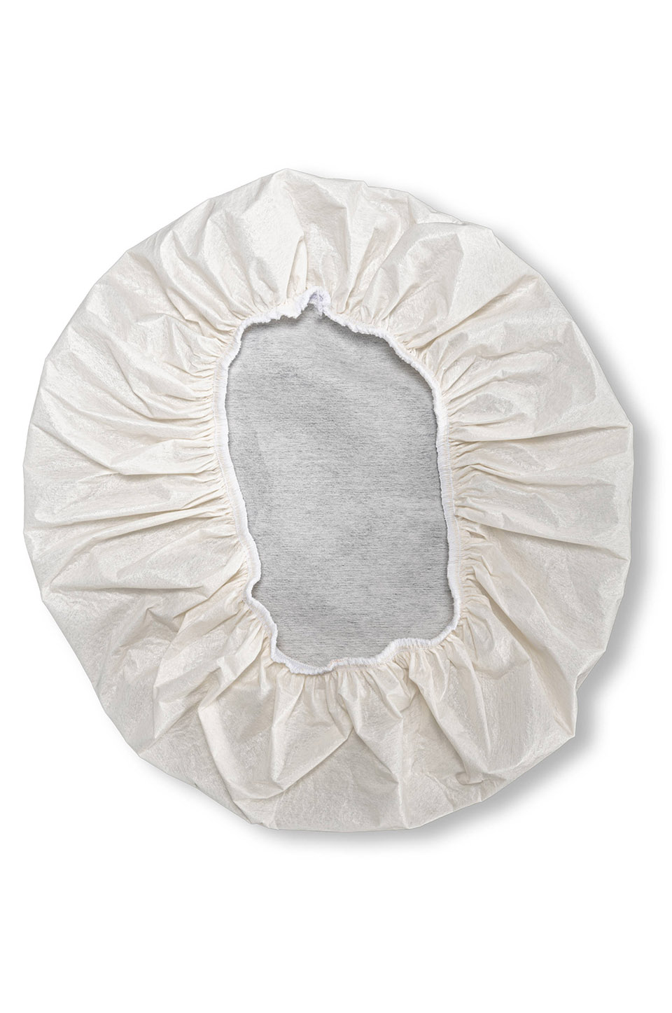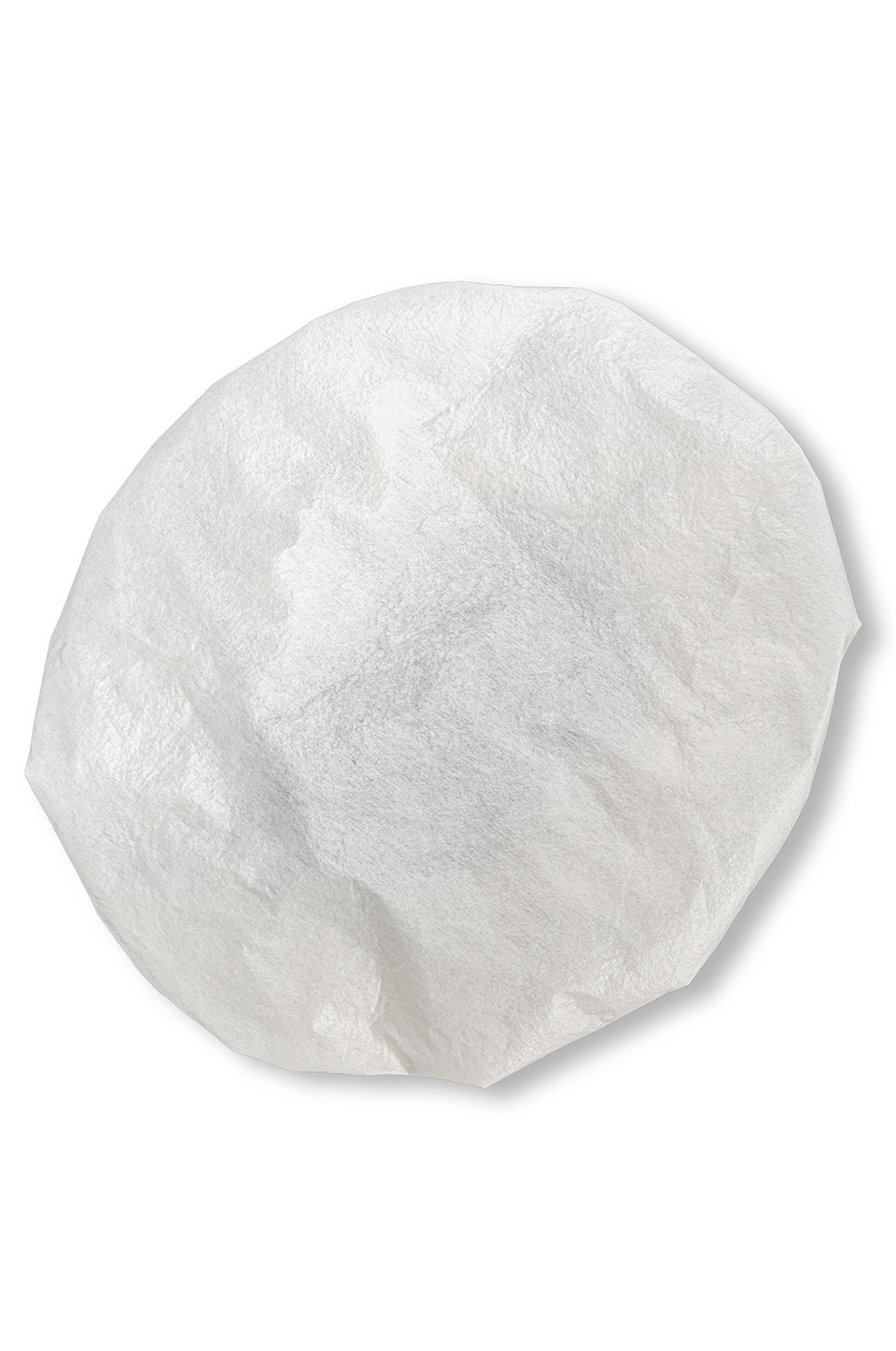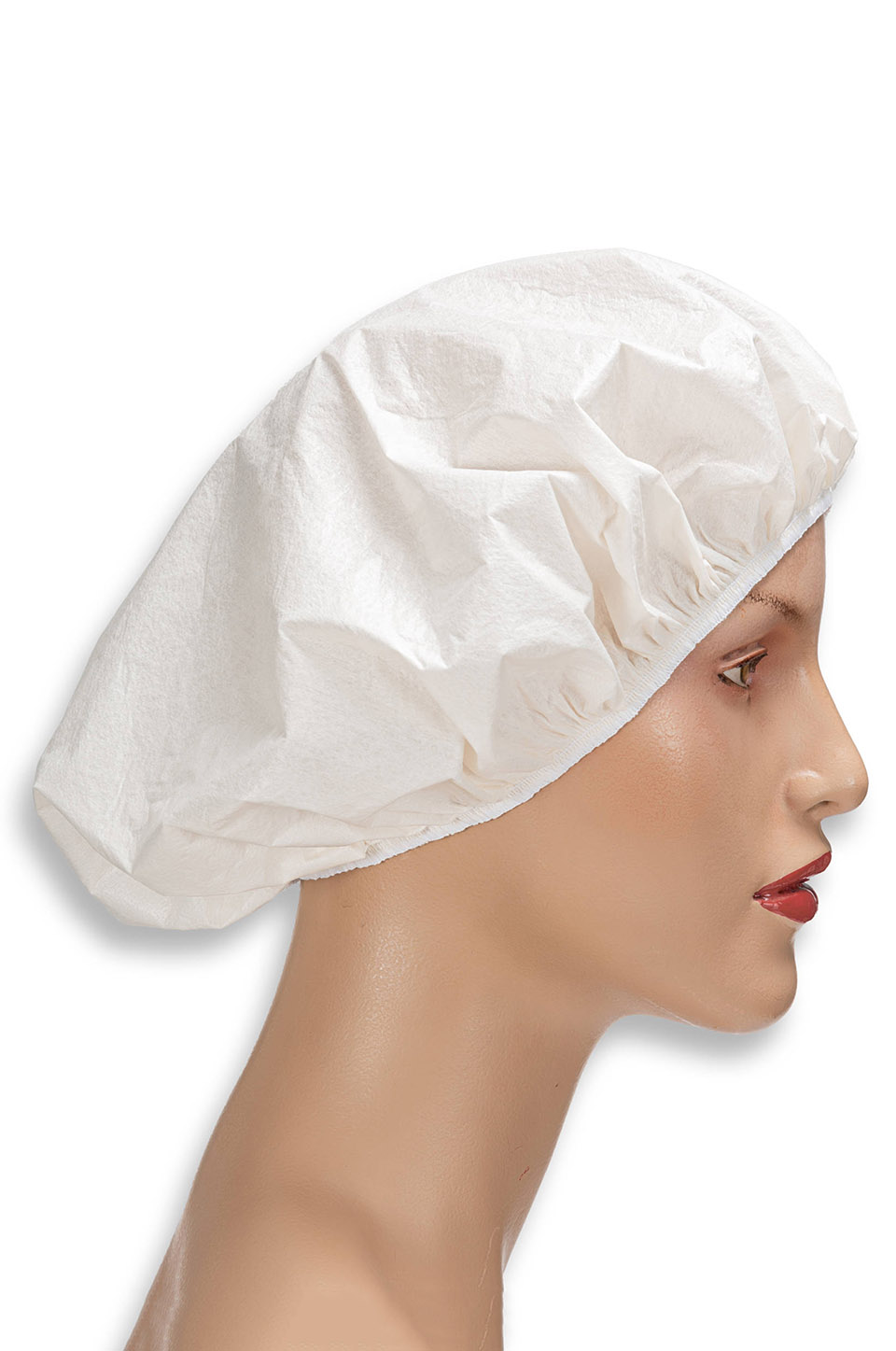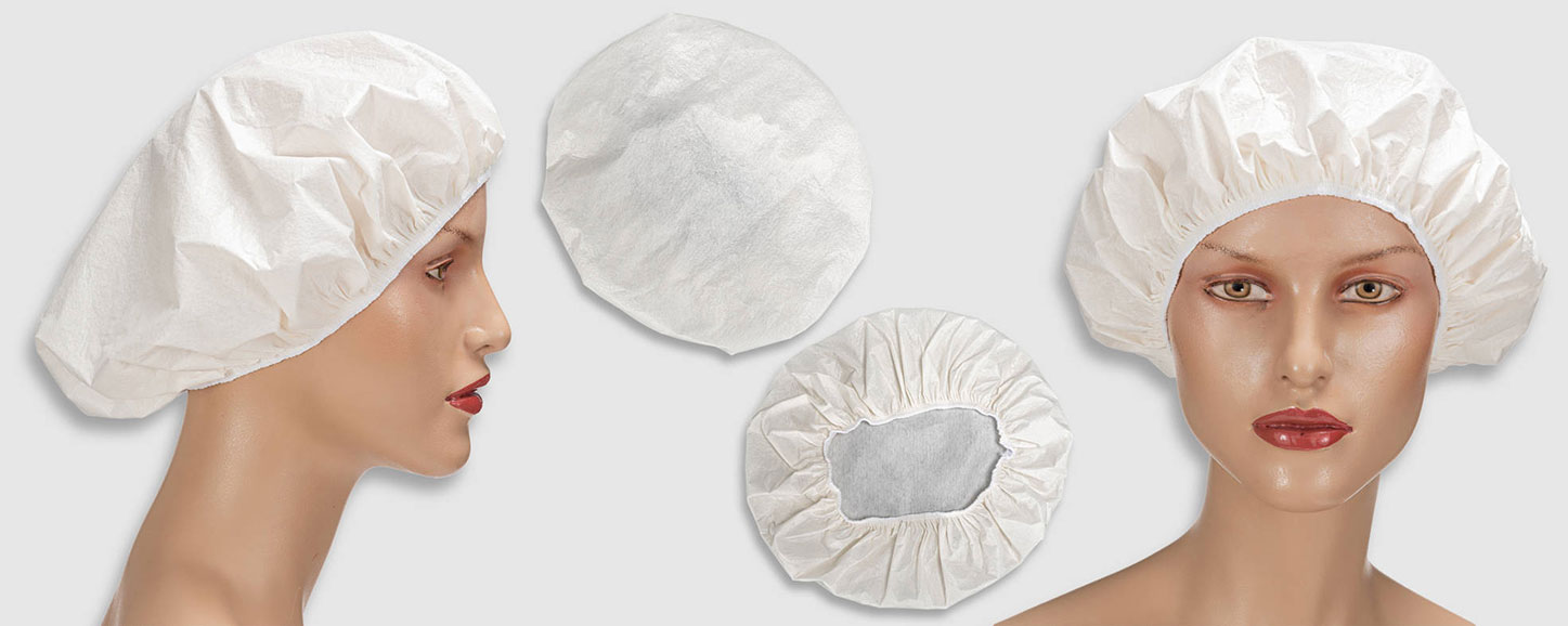 Copricapo, colore ecrù, elastico stringitesta senza lattice con certificazione Oeko-Tex su tutto il diametro. Cucito a macchina e realizzato in forma non sterile e monouso.