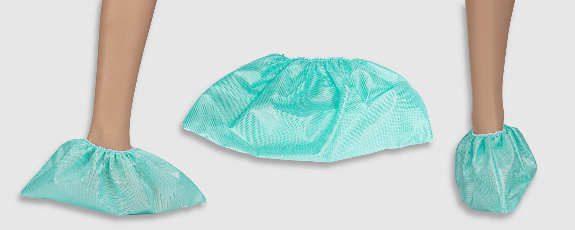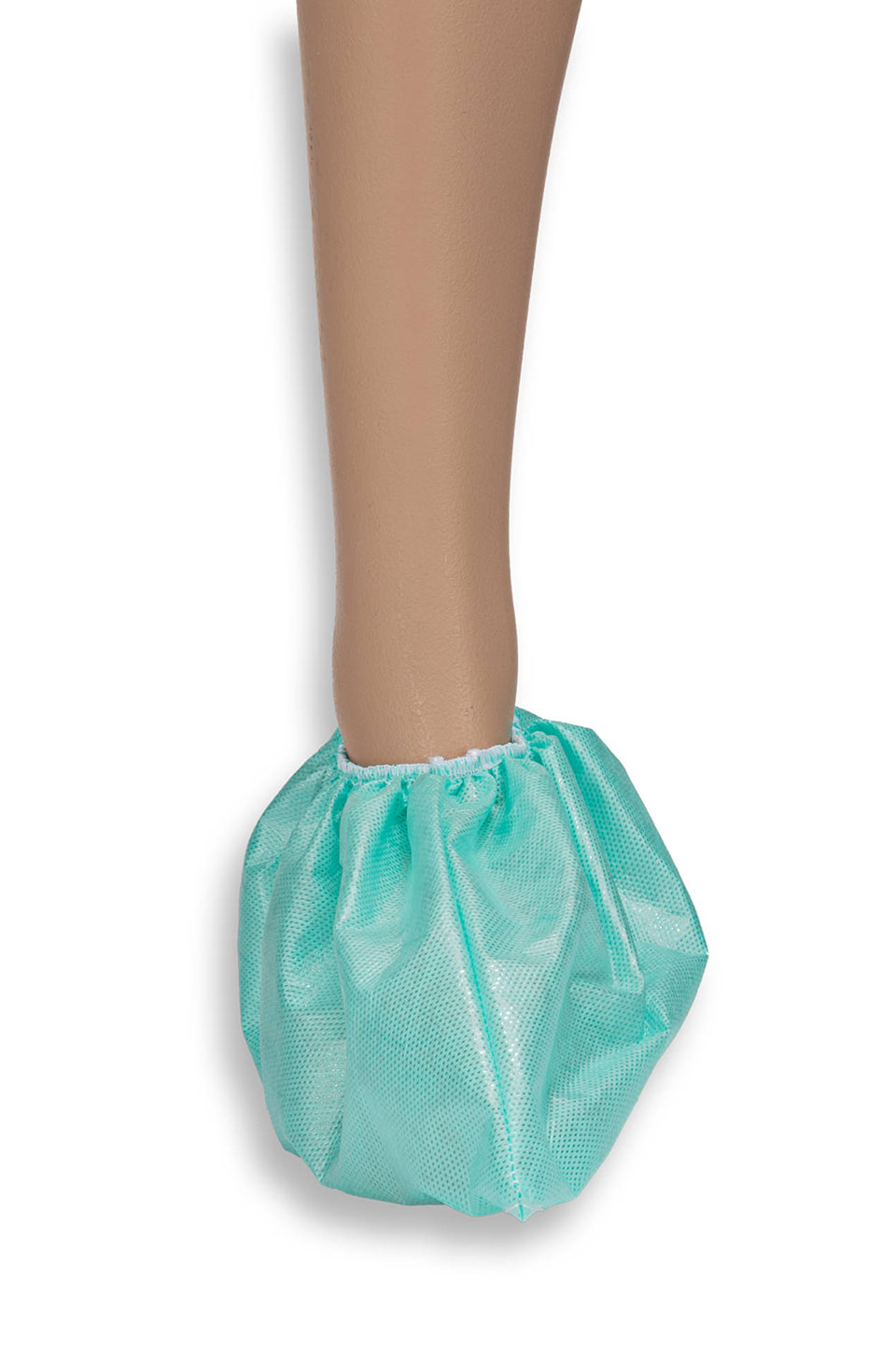 Copriscarpe, colore verde, base antiscivolo senza lattice, elastico stringicaviglia senza lattice. Accessori con certificazione Oeko-Tex. Cucito a macchina e realizzato in forma non sterile e monouso.