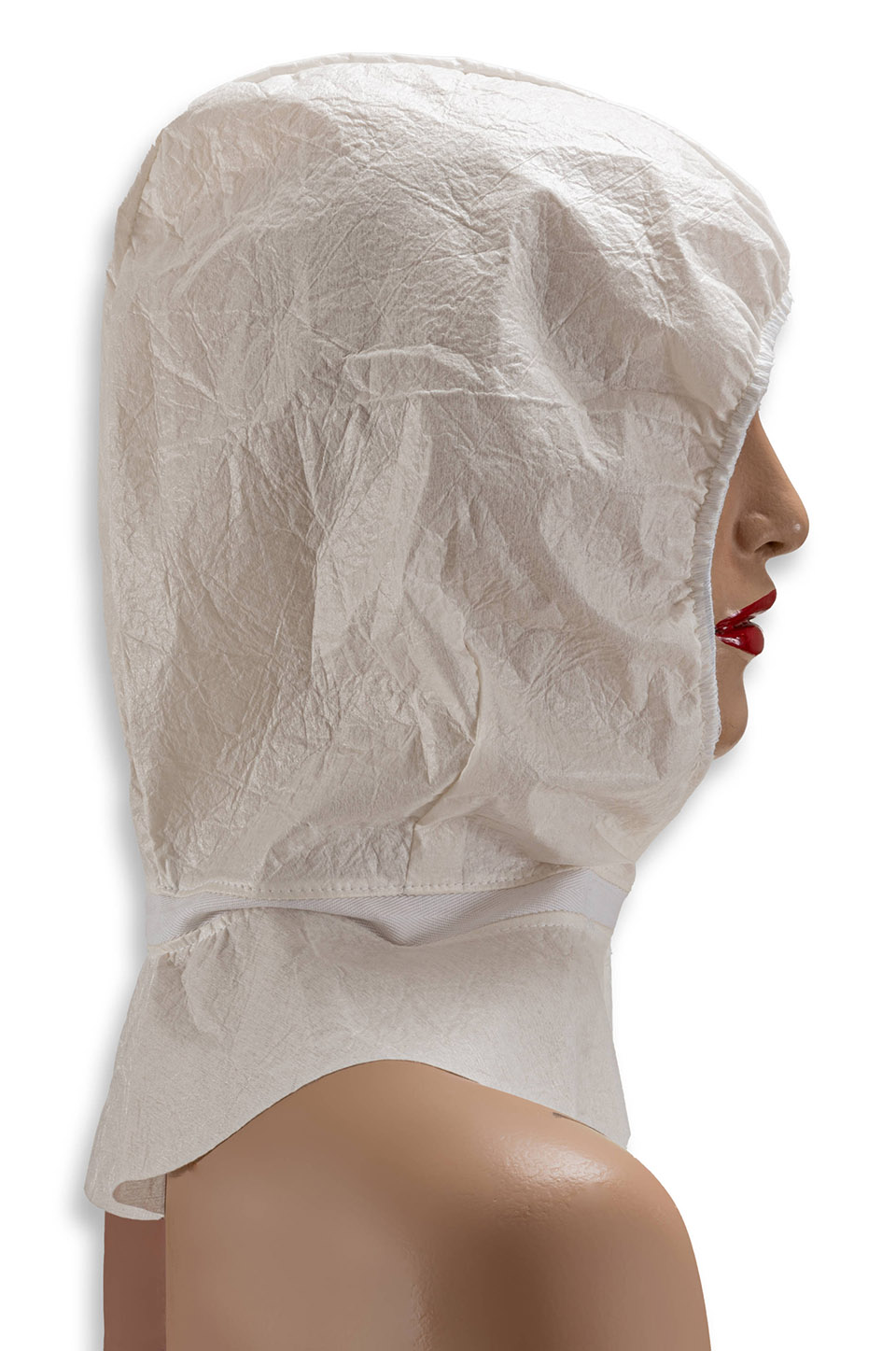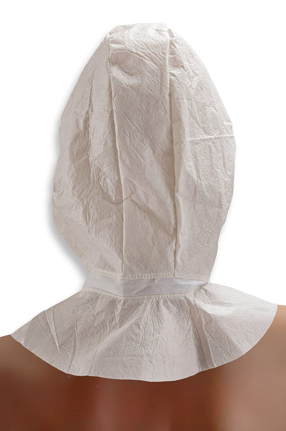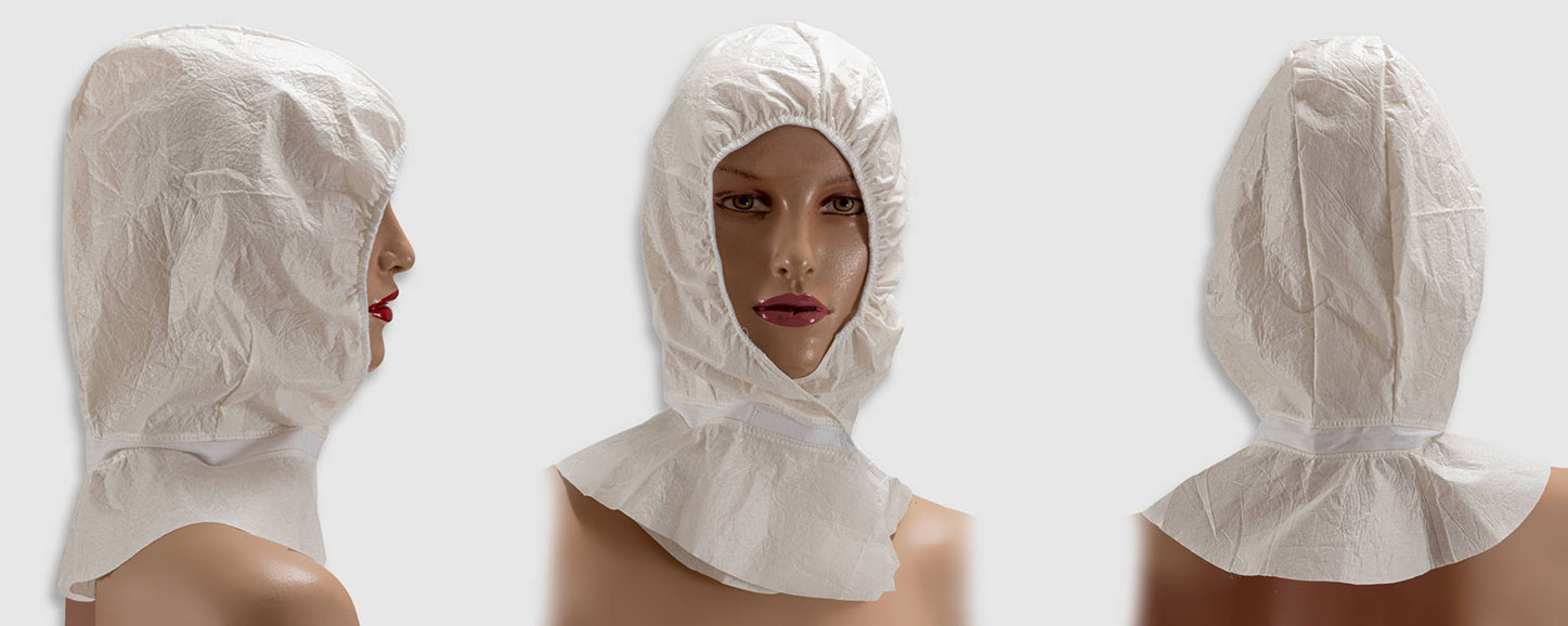 Scafandro di protezione del capo, colore ecrù, elastico stringitesta senza lattice sulla circonferenza del viso, chiusura anteriore in velcro per sovrapposizione, nastro a congiunzione in 100% cotone bianco. Accessori con certificazione Oeko-Tex. Cucito a macchina e realizzato in forma non sterile e monouso.