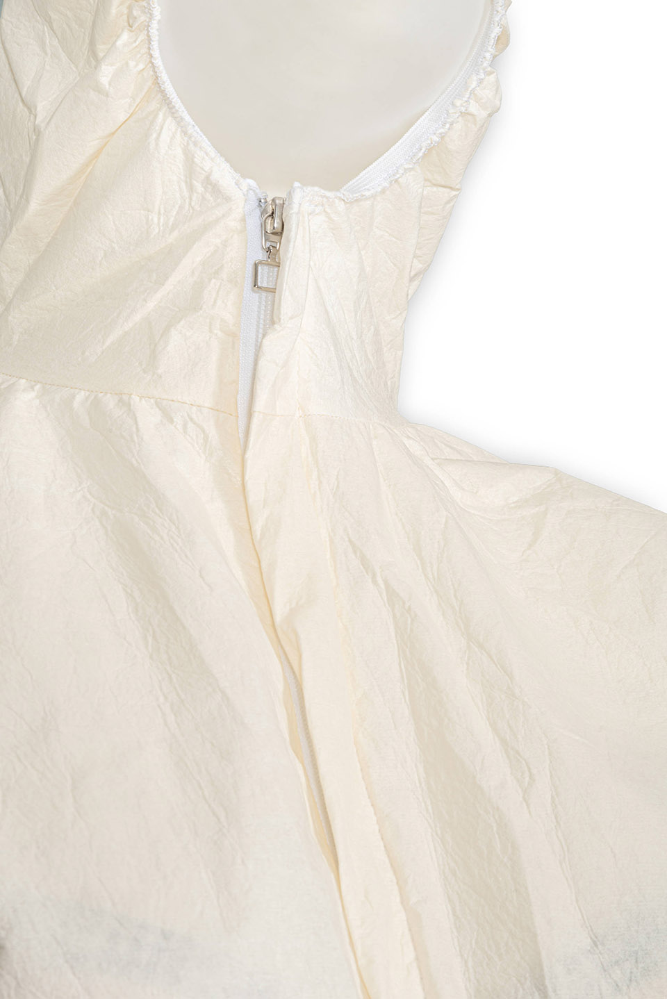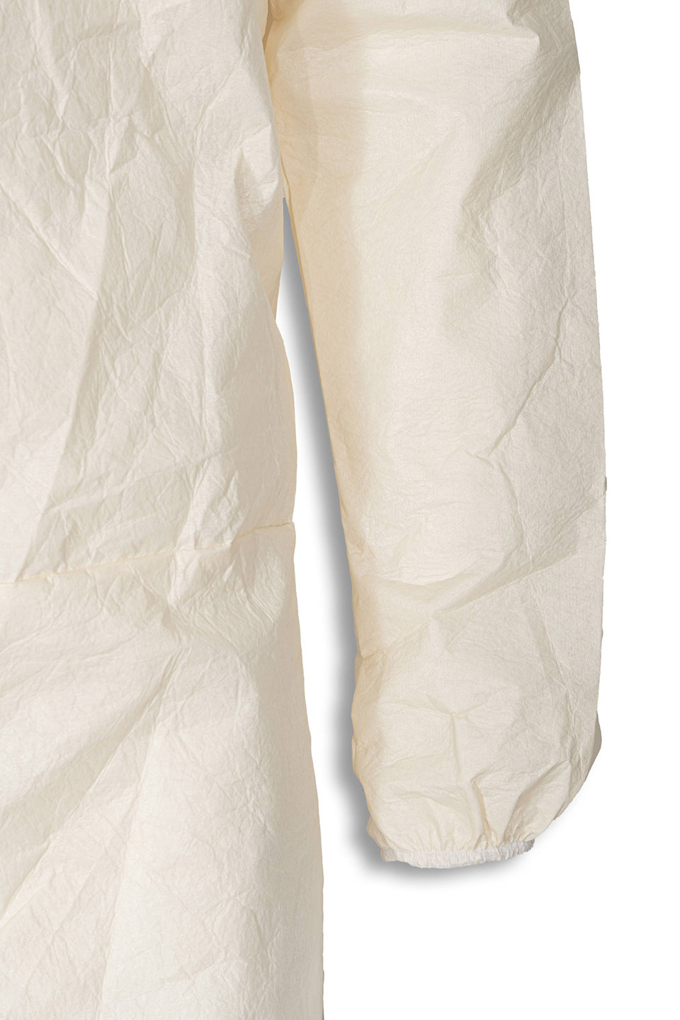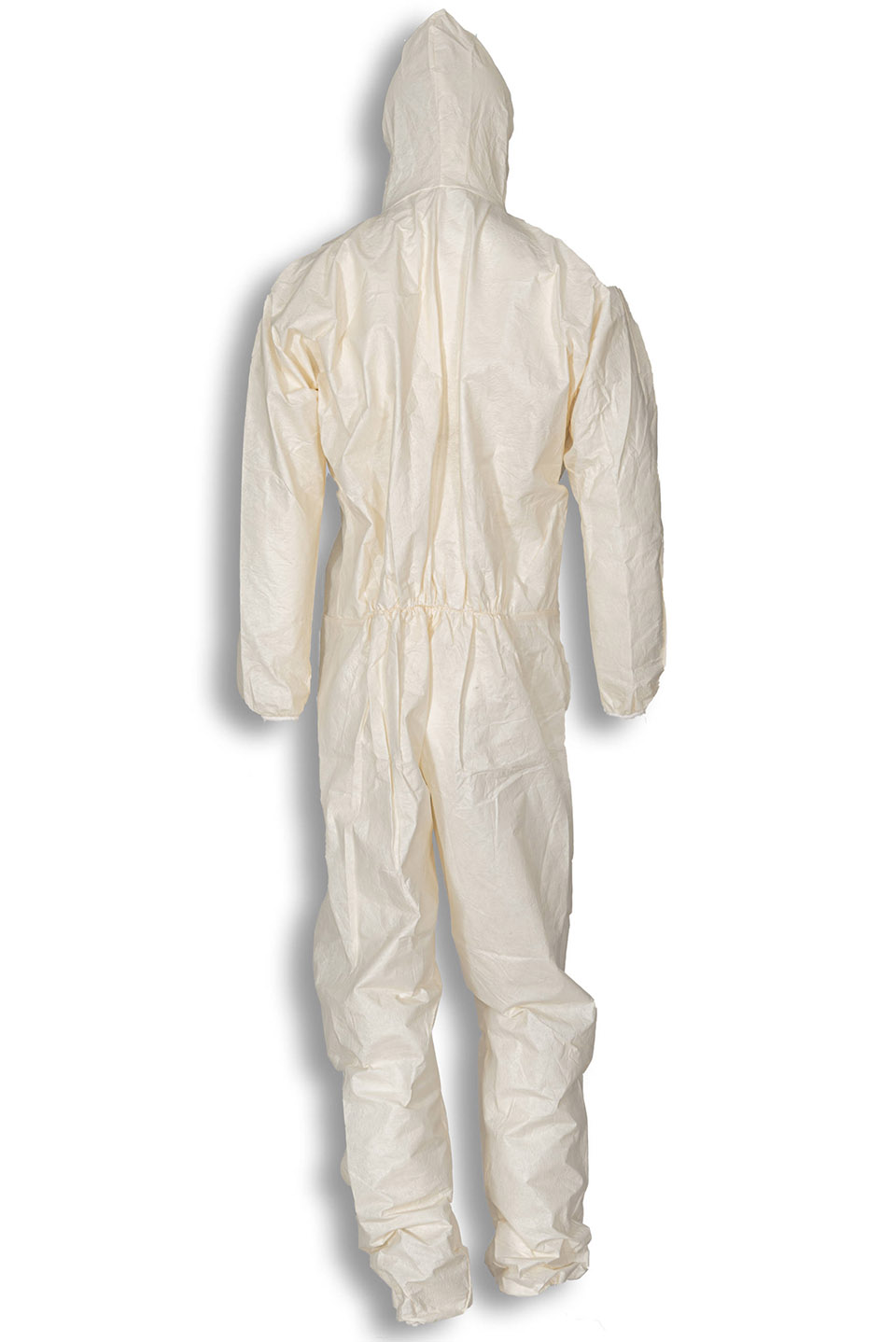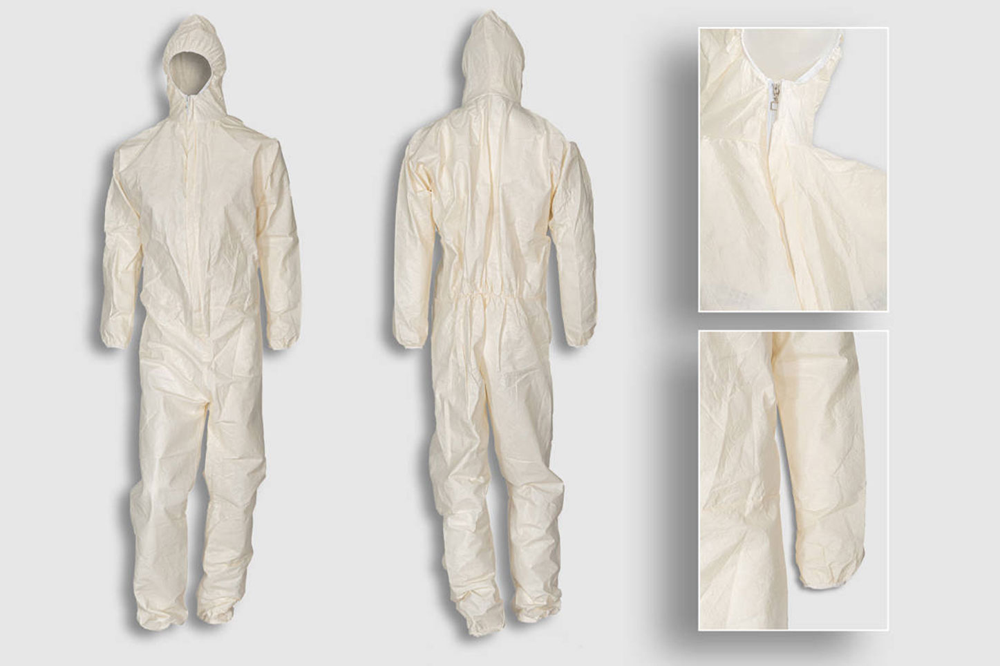Tuta di protezione, colore ecrù, con maniche a giro, è in un solo pezzo con cappuccio, chiusura anteriore con cerniera ricoperta da patta, elastico senza lattice ai polsi, alle caviglie, in vita e sulla circonferenza del viso. È interamente costruita con il materiale dichiarato. Accessori con certificazione Oeko-Tex. Cucita a macchina e realizzata in forma non sterile e monouso.